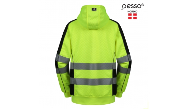 Ryškaus matomumo džemperis su gobtuvu, geltona spalva. Itin aukštos kokybės audiniai neblunka, nesitraukia, nesiburbuluoja.